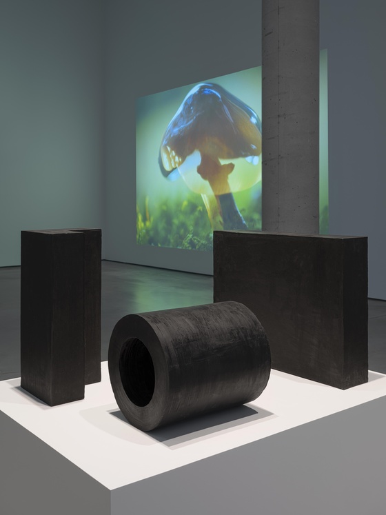 Peter Fischli og David Weiss, Flowers and Mushrooms, 1997-2006, Digital bildefremvisning, 45:54 minutter (loop), Wand aus Gummi (V), 2012, 14.5 x 76.5 x 52 cm, Röhre aus Gummi, sort gummi, 2012, 37 x 32.5 x 32,5 cm og Corner (H), sort gummi, 2012, 25 x 25 x 54.5 cm. Foto: Uli Holz © Peder Lund.