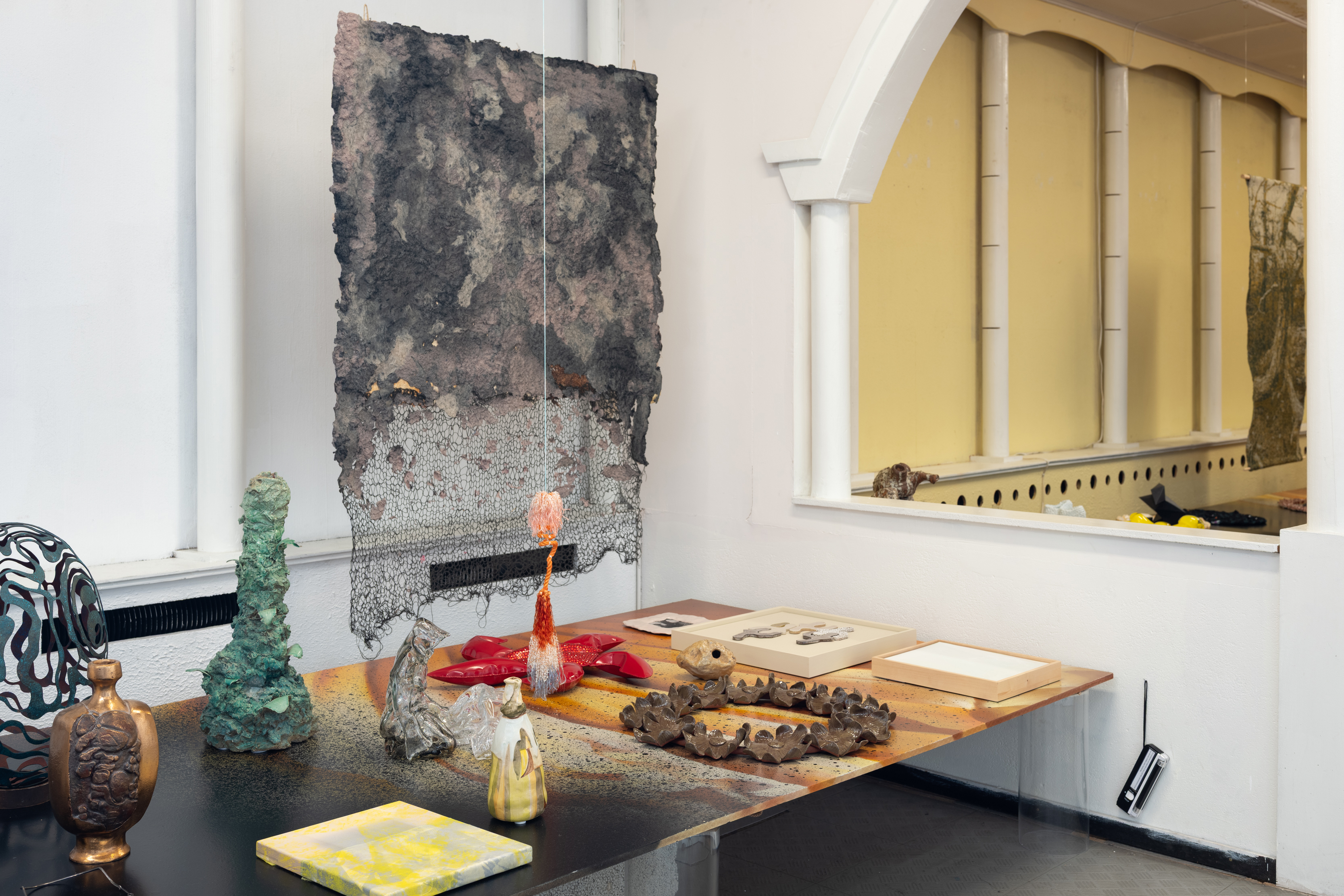 Utstillingens hovedrom var tidligere et salgslokale for vannsenger. Rester av den postmoderne regien med et podium, buer og et ornament som gir fornemmelse av å skvulpe rundt i en vannseng, danner et herlig brudd med alle idealer om det nøytrale og hvitmalte utstillingsrommet. For å lage en kunstsone er det rigget til et langstrakt bord inntil veggen, dekket av kunst. Bordet erstatter den konvensjonelle plinten som løfter frem det enkelte verket og understrekker mengden. For å dele inn verkene i overkommelige porsjoner, har Mathis Anvik spraymalt et sprelsk ornament som folder seg ut over bordplatene. Kuratorteamet har i stor grad bygd grupperingene på en formal familielikhet verkene imellom. De fleste gjenstandene signaliserer at de er håndarbeid, mens noen få har en finish som om de var maskinproduserte designobjekter.