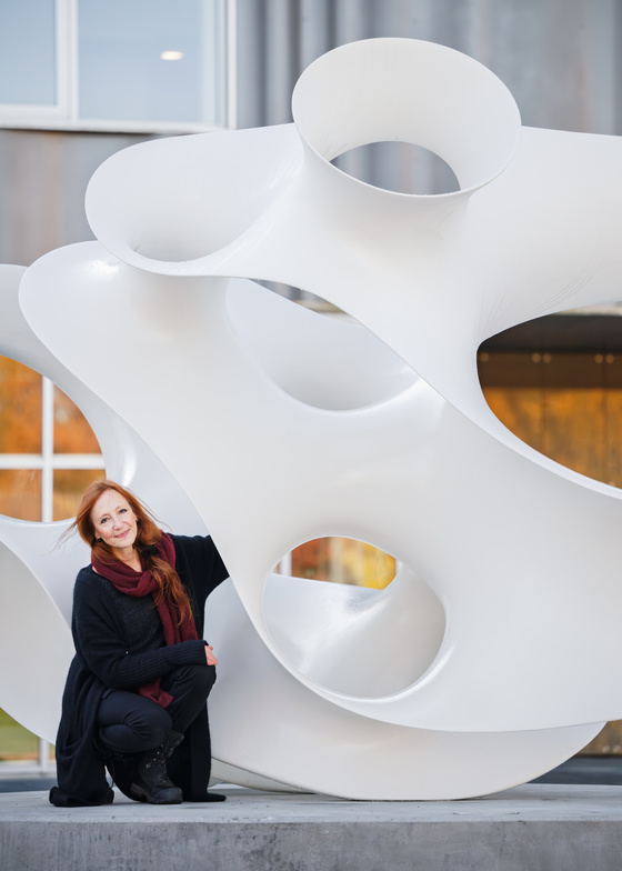 Kunstneren Eva Hild poserer med skulpturen Layer. Foto: Carsten Aniksdal