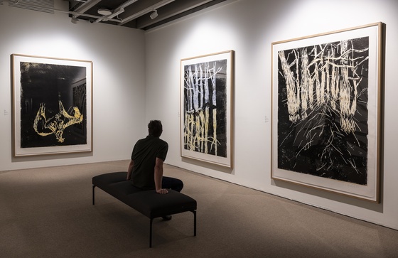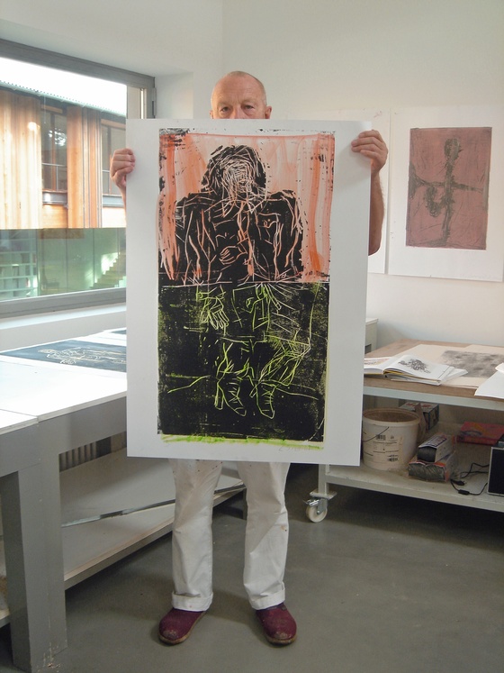 I den andre hovudsalen er der dei verkeleg enorme verka er utstilt. Det største er 2.80 høgt og 1.80 bredt og er imponerande både i størrelse og korleis dei i det heile tatt fekk det inn i bygget. I ein mangefasettert serie møter vi kona Elke i profil, ein kvinneleg akt med heva armar, ei naken kvinne med ryggen til oss. I desse grafiske verka er det eit skjeringspunkt mellom det mjuke og det harde. Det er eit lag av noko utflytande og spøkelses-aktig som gjev grafikken liv, men som også mjuknar dei harde kontrastane eg har møtt elles i utstillinga. Men når eg står og ser lenge nok på dei enorme verka byrjar eg å lure... Er det i sjølve verket det utflytande grå som eg likte så godt finnes eller er det ei grå hinne som har festa seg mellom det grafiske verket og glasplata utanpå? For meg verkar det som om det faktisk er ein feil, at det ligg eit lag av kondens eller eit fuktslør mellom verket og glaset.