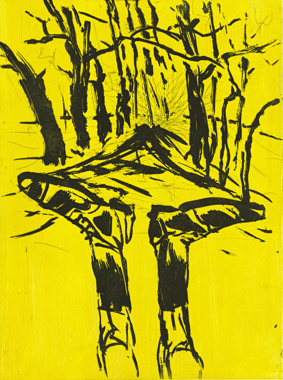Og kvar er eigentleg samarbeidspartnar og kona Elke i denne historia? Ho dukkar opp på fleirfaldige billedflater gjennom heile kunstnarskapen hans og gjennom heile utstillinga. Men i narrative som vert fortalt er ho Baselitz’ muse og ikkje noko anna. Sjølv om det er sagt at Elke arbeida med å trykke grafikken heilt fram til 80-talet.