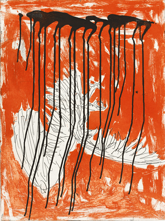 Baselitz reiv vengene av det tidlegare nazistiske symbolet ved å snu ørna opp ned. Georg Baselitz: Hanoverian Loyalty (Hannoversche Treue), 2010. Foto: Jochen Littkemann © Baselitz Archive.