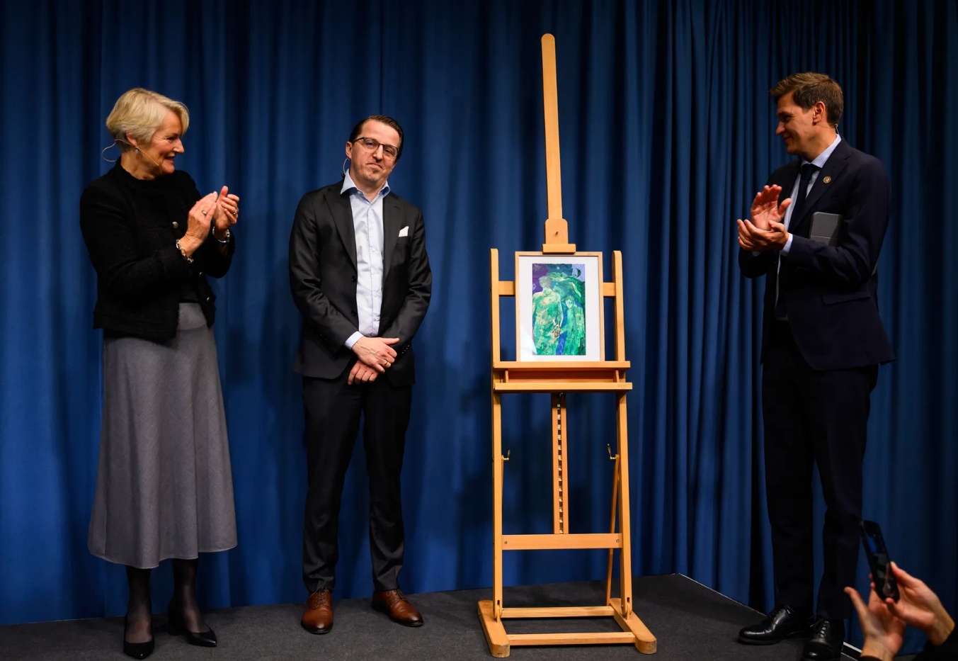 Sverre Bjertnæs (i midten) er kunstneren bak det nye Nobeldiplomet. Foto: Johannes Granseth / Nobels Fredssenter / Handout / NTB