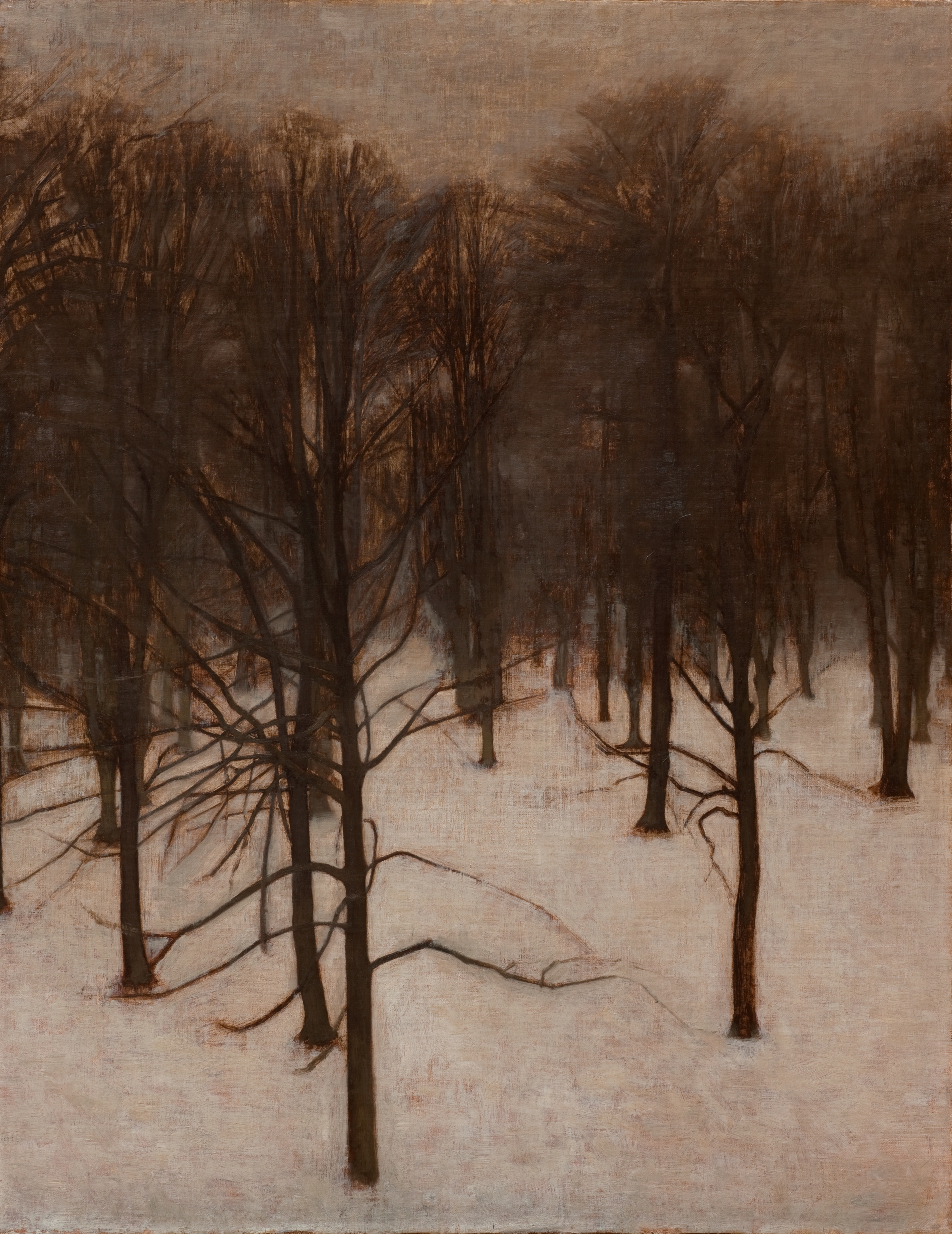 Den gråbrune himmelen, Hammershøis grunning av lerretet, blir stadig svartere jo nærmere vi kommer forsvinningspunktet i skogsdypet. Trærne i forgrunnen fremstår levende, grenene som frenetiske overlappinger av edderkoppben. Snøen, utenom himmelen, det eneste som gir kontrast til scenen. Denne er det siste Hammershøi har lagt til motivet, og dette mykner opp scenen, konturlinjene og gir denne duse silhuetten som Hammershøi kanskje mer enn noe annet er kjent for i bildene fra Strandgade 30 og 25. Naturmaleren Hammershøi i denne perioden er ikke mindre magisk. De fravendte figurene fra interiørene er her erstattet av de vakre, halvt uhyggelige trekonstellasjonene, som smelter sammen i perspektivet.