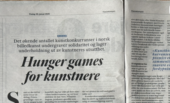 I kronikken «Hunger games for kunstnere», publisert i Klassekampen (30.01.2026), beskriver Marianne Heier det økende antallet sponsorbaserte konkurranseutstillinger i norsk billedkunst det siste tiåret som et «Hunger games for kunstnere». Nevnte eksempler på slike konkurranseutstillinger er Lorck Schives kunstpris, Sparebankstiftelsen DNBs kunstpris, Sandefjord Kunstforenings kunstpris og Eckbos Legats kunstpris [Red. Eckbos Legat kunstnerstipend / Eckbos Legat stipendutstilling]. Det mer enn antydes at sponsorbaserte konkurranser undergraver solidariteten og gjør kunstneres utsatthet til underholdning. Metaforen er slående, men misvisende. Den bidrar i liten grad til en presis analyse av kunstfeltets økonomiske og institusjonelle virkelighet. The Hunger Games er en interessant, dystopisk voldsfantasi, ikke en treffende analogi til kunstpriser.