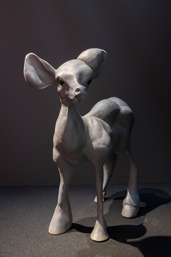 Avvikene i ben, hover og gestalt viser at det er konstruert etter dataprogrammer, ikke modellert naturalistisk etter studier av en hjort. Hjort er i virkeligheten et klovdyr. Ann Lislegaard, The Avatar, 2020. Resirkulert aluminium. Foto: Øystein Thorvaldsen / Henie Onstad Kunstsenter.