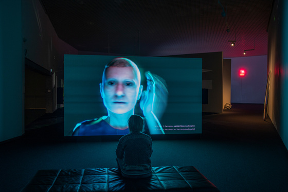 Kyborgen er modellert etter kunstneren selv og vises vekselvis med opptak av undersjøiske scener. Malstrømmen blir i dette verket en «kontaktsone» der kyborgen mottar signaler fra ukjente organismer. Ann Lislegaard, Malstrømmen, 2017, 3D-animasjon. Installasjonsbilde. Foto: Øystein Thorvaldsen / Henie Onstad Kunstsenter.