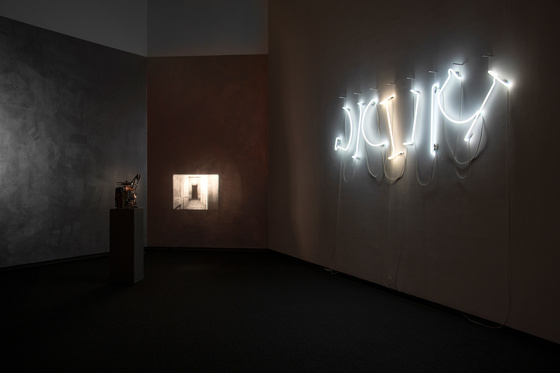 Verket er satt sammen av funnede neonfragmenter. Delene kan ikke settes sammen til meningsfulle ord og er typisk for nyere kunsts «angrep på signifikanten». Ann Lislegaard, Installasjonsfoto. Neonverket har tittelen Algorithms_remains of a language, 2016-2025. Foto: Øystein Thorvaldsen / Henie Onstad Kunstsenter.