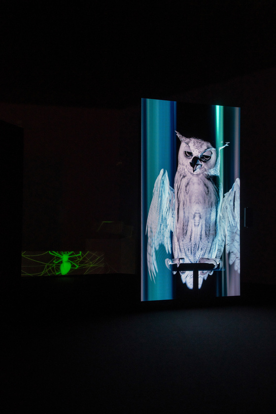 Utstillingen er kuratert slik at en utløper av et verk kan ses i samme rom som det sentralt plasserte verket. I bakgrunnen for den kunstige uglen ses her en del av refleksjonen av edderkoppens nett fra verket Spinning and Weaving Ada, som i hovedsak er plassert bak en vegg og usynlig fra fotografens posisjon. Ann Lislegaard: Oracles, Owls … some animals never sleep, 2022. Henie Onstad samlingen. Erhvervet med støtte av Ny Carlsbergfondet. Foto: Øystein Thorvaldsen / Henie Onstad Kunstsenter.