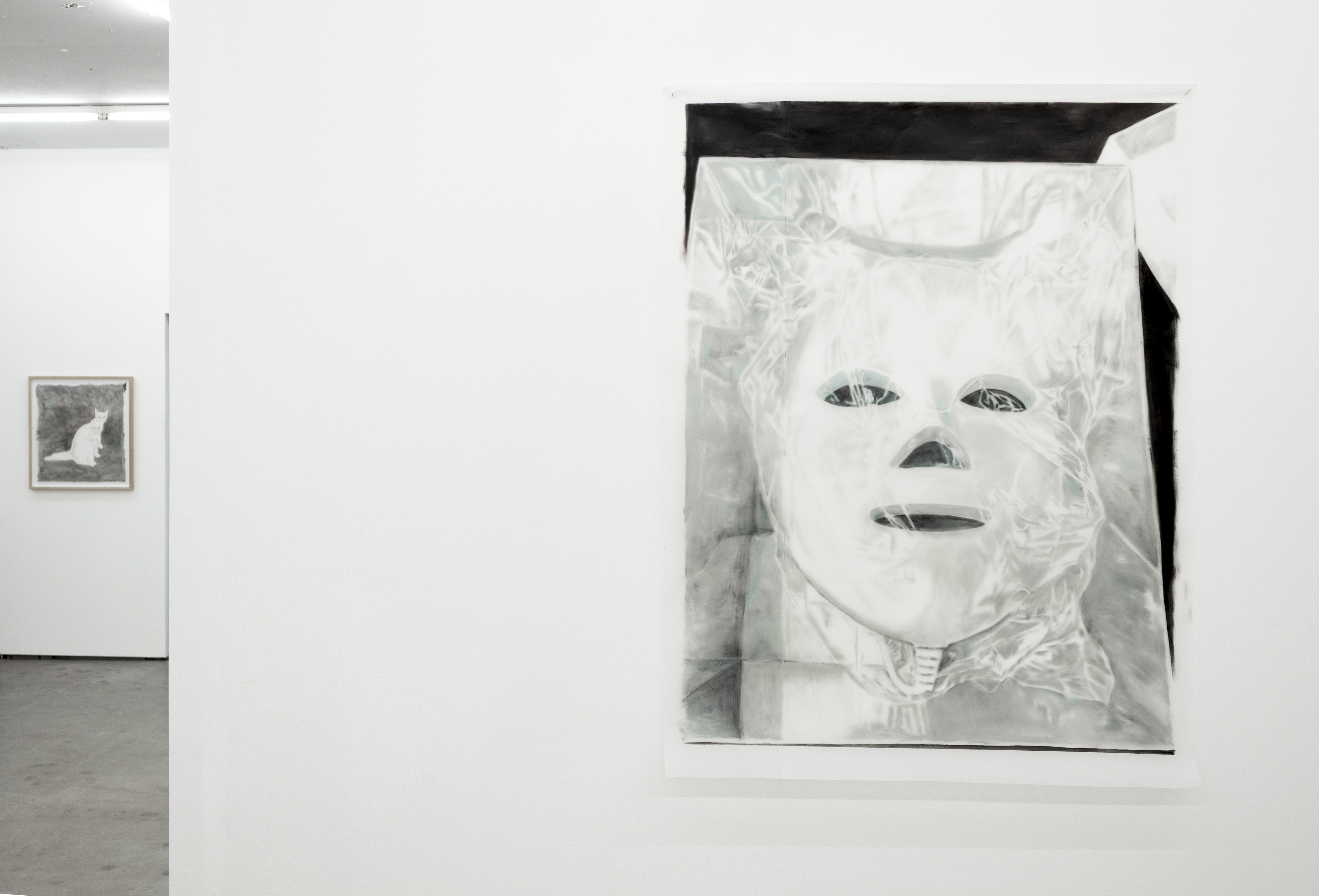 Ved inngangsdøren henger Gaengers Tre katter, 2025. Tre skumle, hvite katter med isblågrå øyne som ser mot betrakteren. Jeg har hatt hvit katt selv, og kjenner igjen blikkene: prøver du å kose, løper de vekk. Utilgjengelig og helt egen slik bare katter kan være – uten vilje til å anerkjenne at de er helt avhengig av eieren sin.