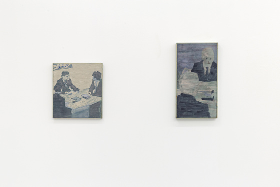 Karsten Krogh-Hansens bidrag tar for seg motiver knyttet til det seriøse, dresskledde voksenlivet. Over vinduene henger to avlange bilder med titlene Arbeidsgruppe 1 og – 2 som viser en gjeng ansiktsløse kontorarbeidere, malt i en liksom utvasket stil. Plasseringen og formen på bildene minner om reklamer man kan se for eksempel på trikken. Dette er bilder som sier adjø til alle illusjoner om et glamorøst liv i enden av tunnelen. Dressen fremheves som uniform. Det er som om alle disse malerne i starten av karrieren slår fast: det finnes ingen fremtid å drømme om.