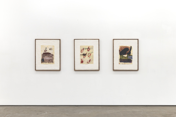 «Ærlige» materialvalg. Markus Myhre bruker olje og bivoks på papir, gips og eik. Markus Myhre, Av gårde igjen, 2025. Markus Myhre, Himmellegemer, 2025. Markus Myhre, Nattfiske, 2025. Foto: LNM